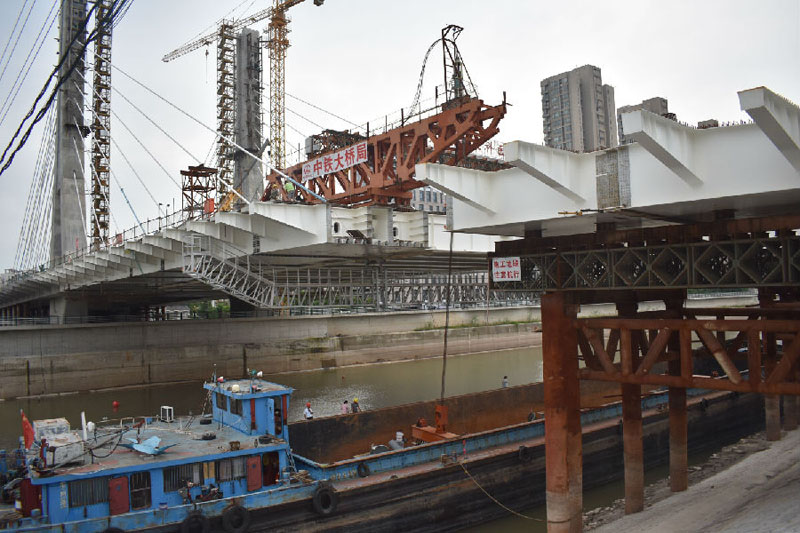 中江橋主橋合龍后,將按順序進行后續(xù)MB10、MB11節(jié)段安裝,計劃十一月中江橋主橋鋼箱梁、預制橋面板全部安裝完成。