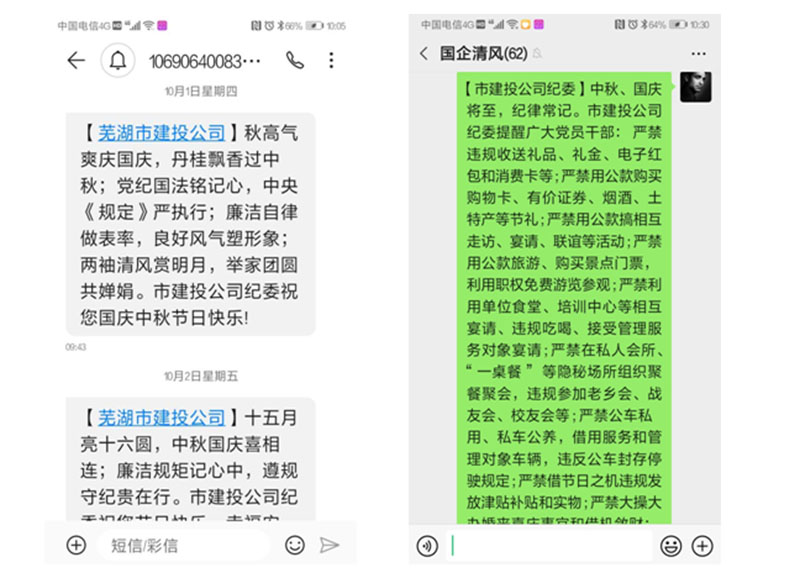 發(fā)送廉政短信。中秋國(guó)慶前期和期間,公司紀(jì)委向全體干部員工及控股企業(yè)領(lǐng)導(dǎo)班子成員累計(jì)發(fā)送廉政短信348條次,通過(guò)企業(yè)微信群累計(jì)發(fā)送廉政提醒14次,在表達(dá)節(jié)日祝福的同時(shí),提醒廣大領(lǐng)導(dǎo)干部嚴(yán)格遵守廉潔自律各項(xiàng)規(guī)定,繃緊廉潔自律這根弦,筑牢拒腐防變這道防線(xiàn)。