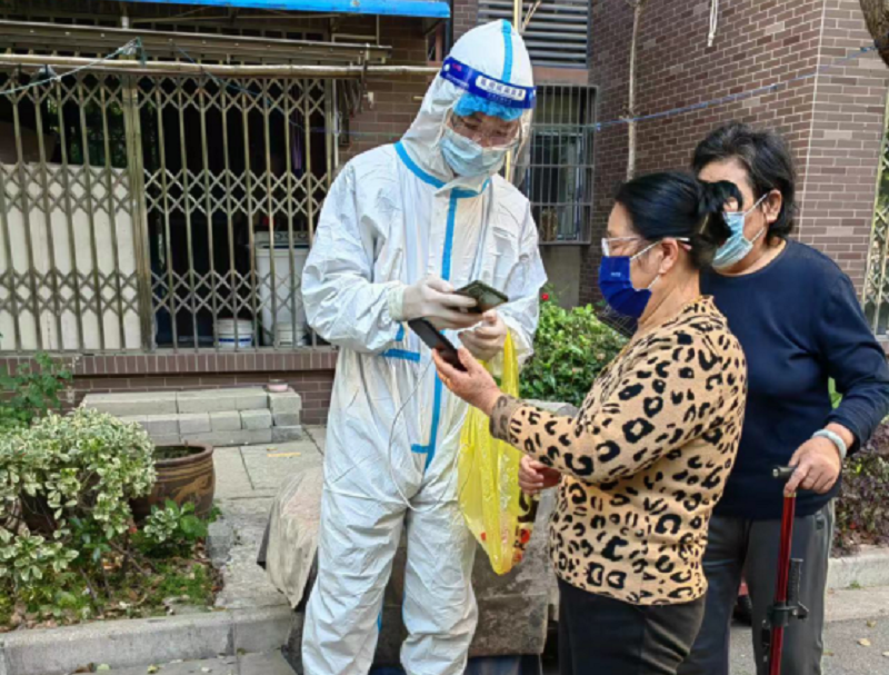 部分黨員志愿者在鏡湖區(qū)某封控社區(qū)內對居家隔離人員進行上門核酸檢測。